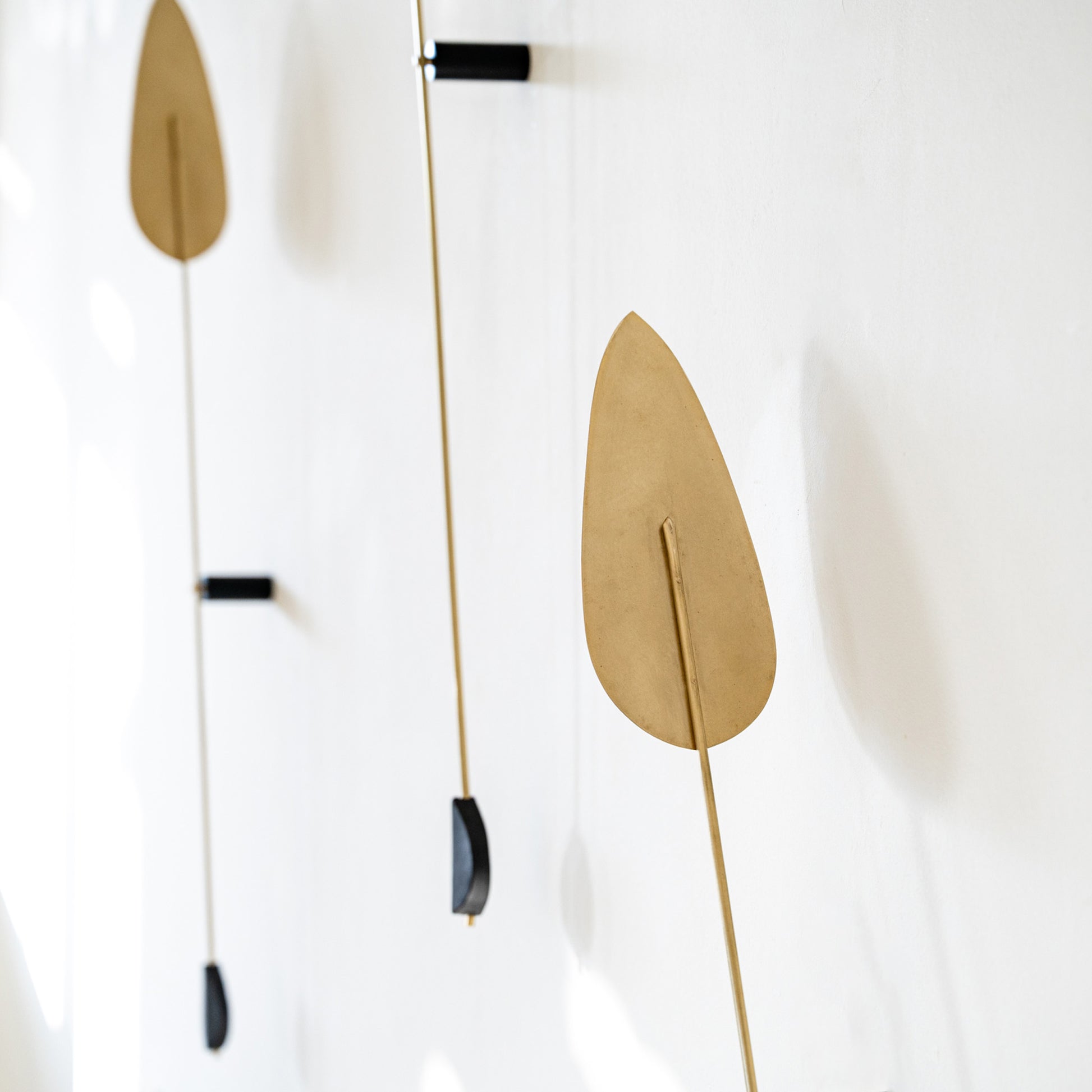 A wall-mounted kinetic piece composed of three independent elements, each delicately balanced between a brass “sail” and a ceramic weight. Suspended on their own axes, they gently rotate with the movement of air.