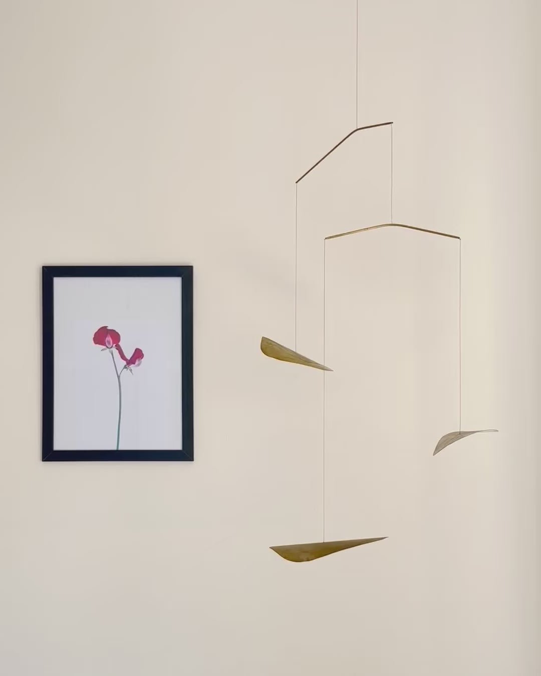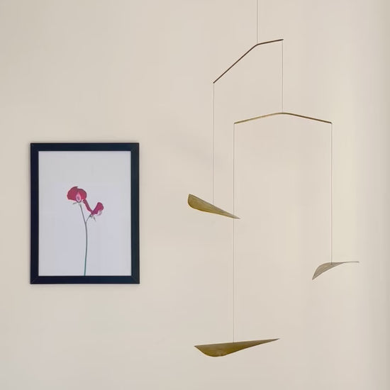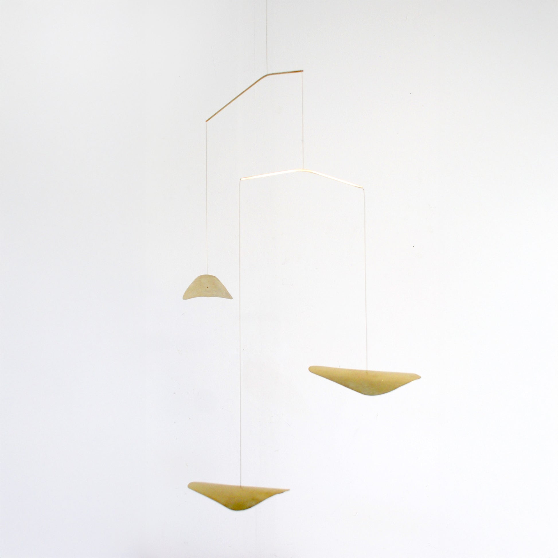 A minimalist and modern decorative mobile, handmade out of brass. While it gently moves to the flow of air, the mobile catches the eye, gives a calming sense, and creates a nice soft light reflection.