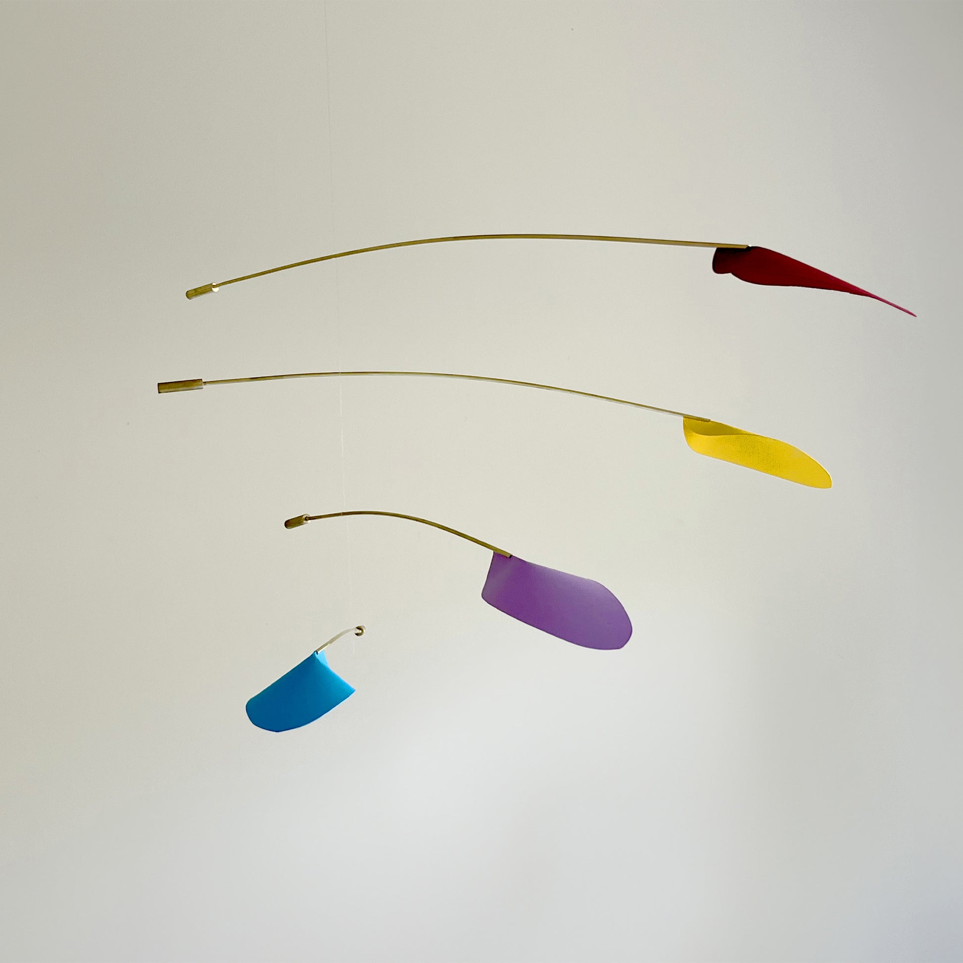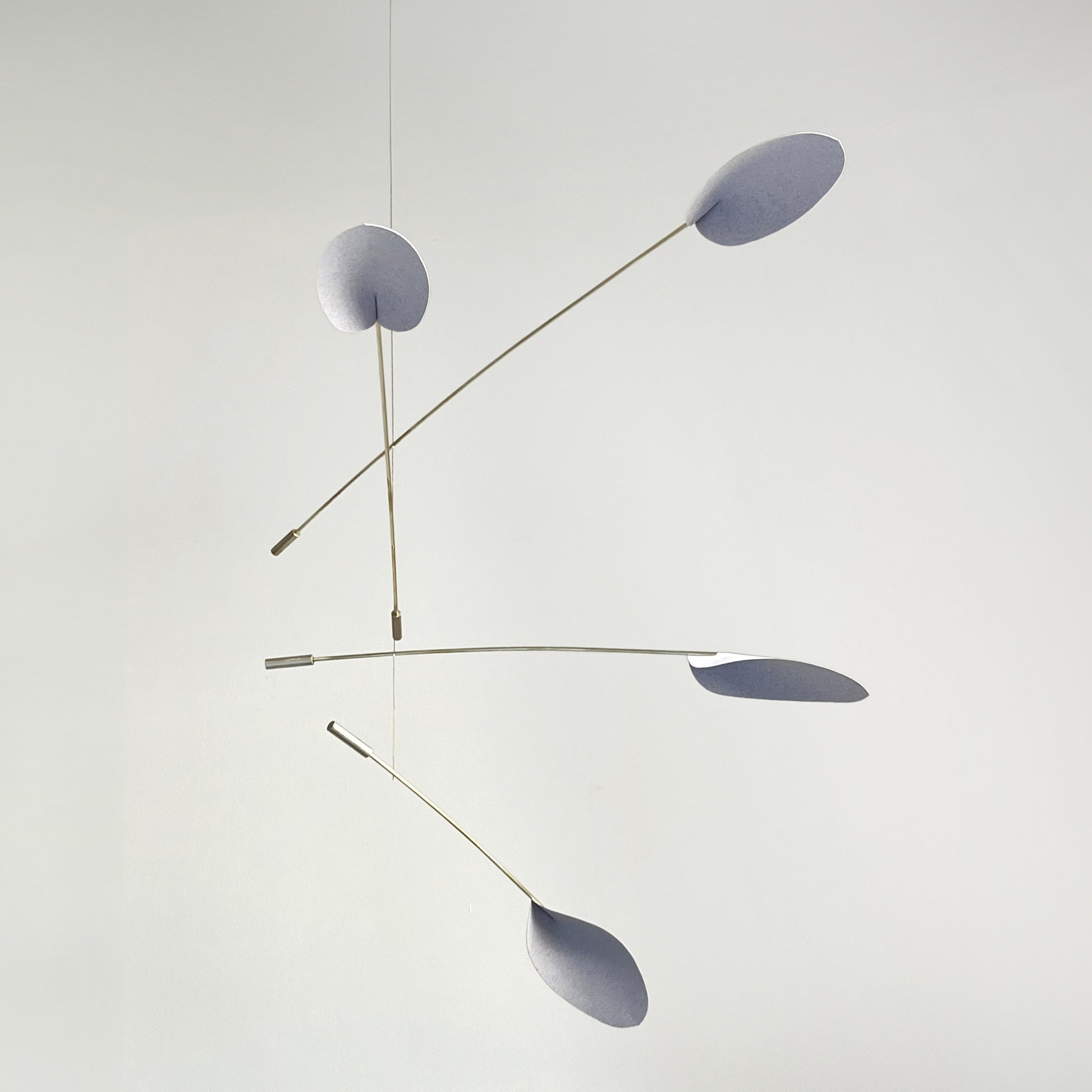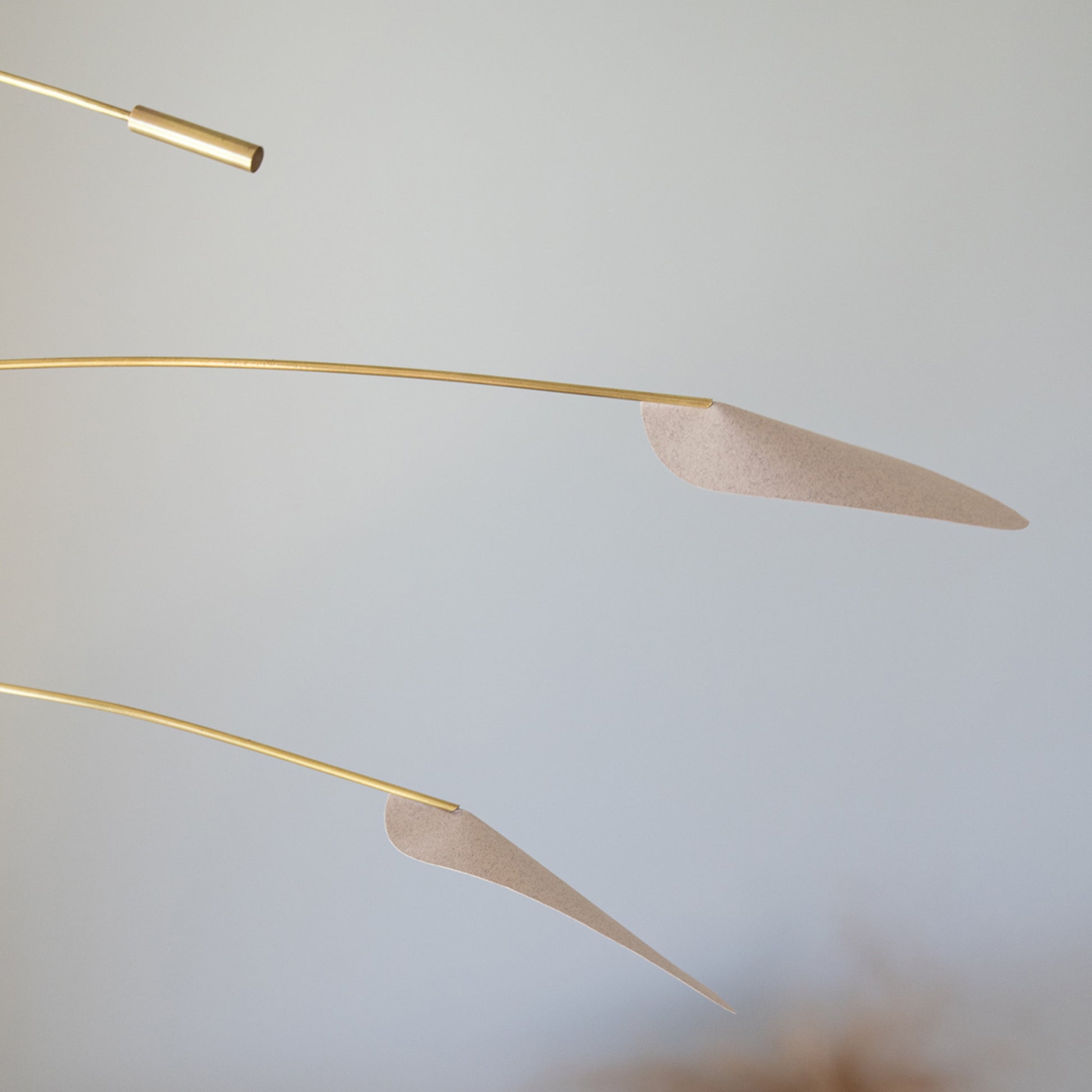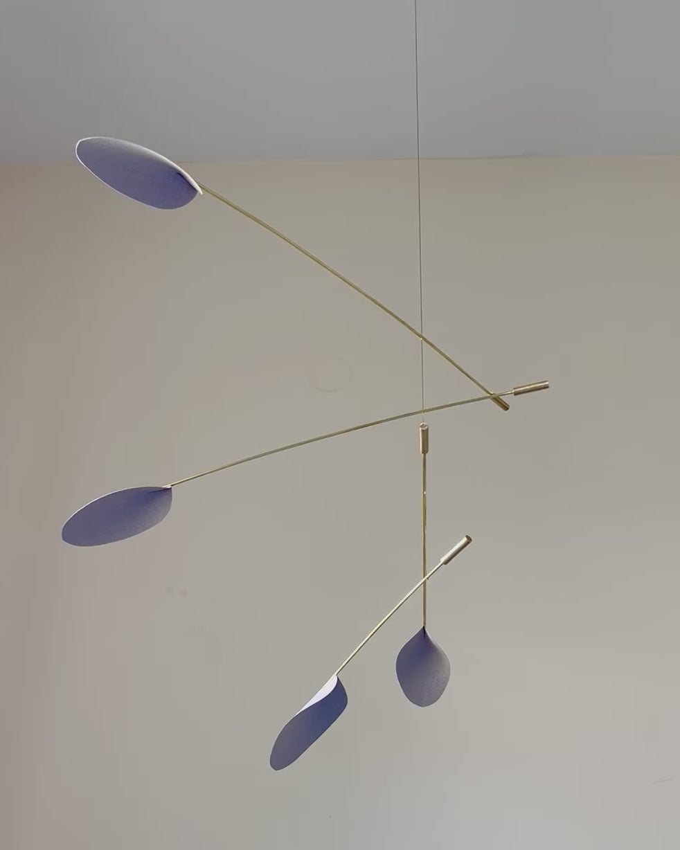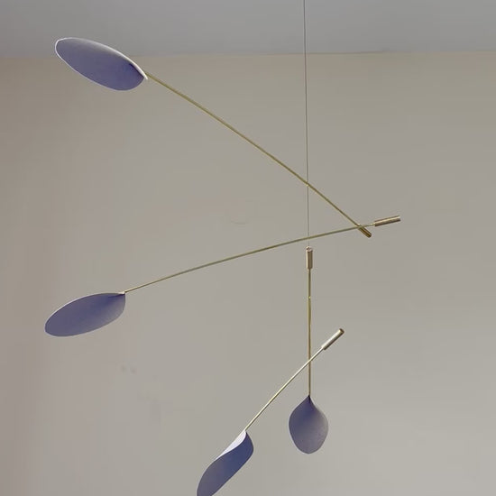 A unique, handmade kinetic mobile, combining the strength of polished brass with the lightness of quality paper. Silent, captivating kinetic movement that adds sophistication and elegance.
