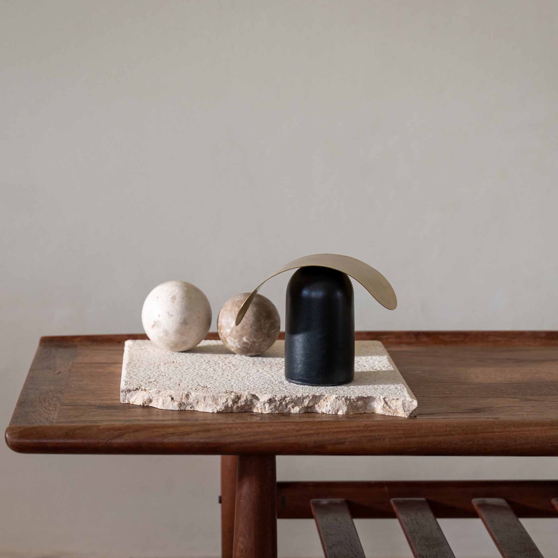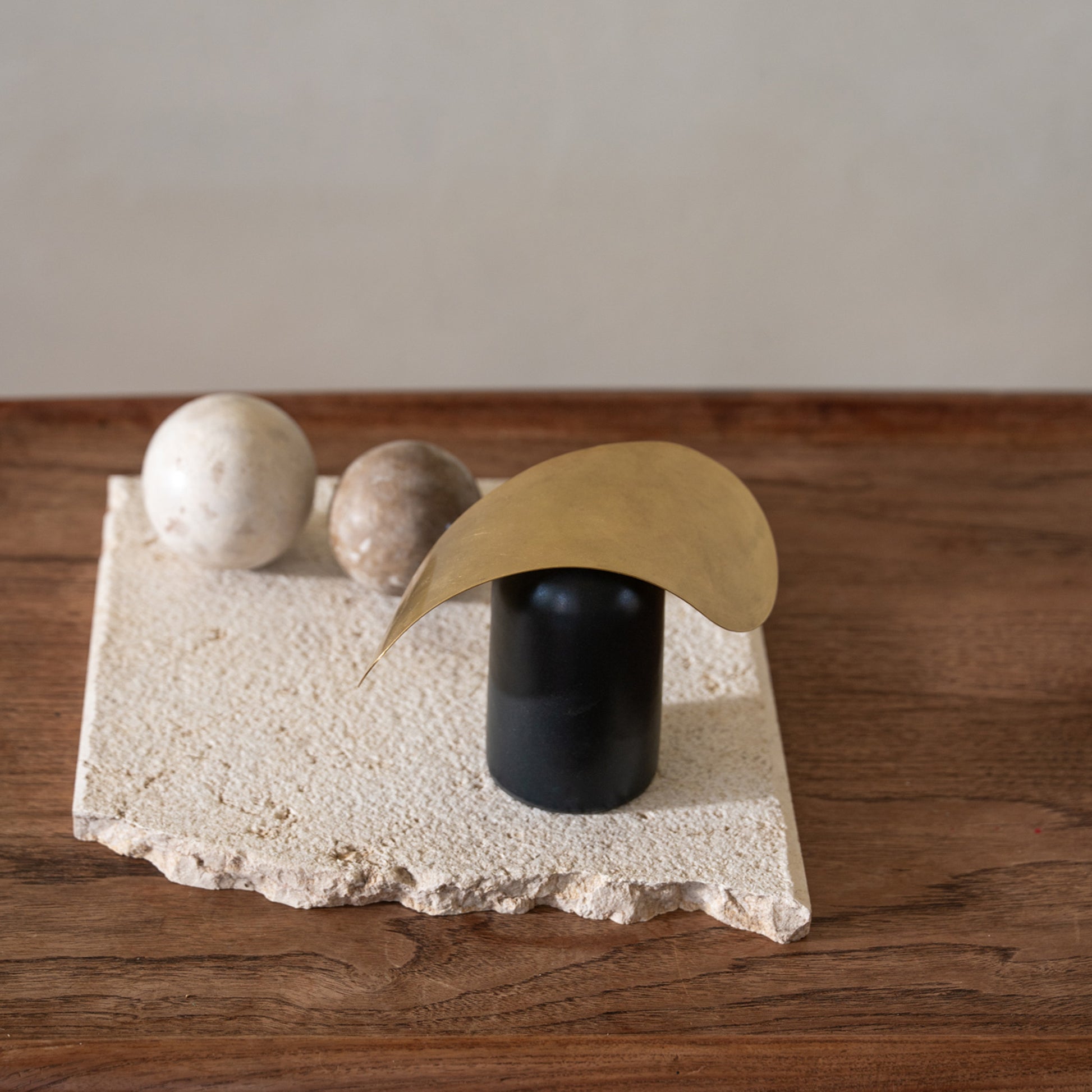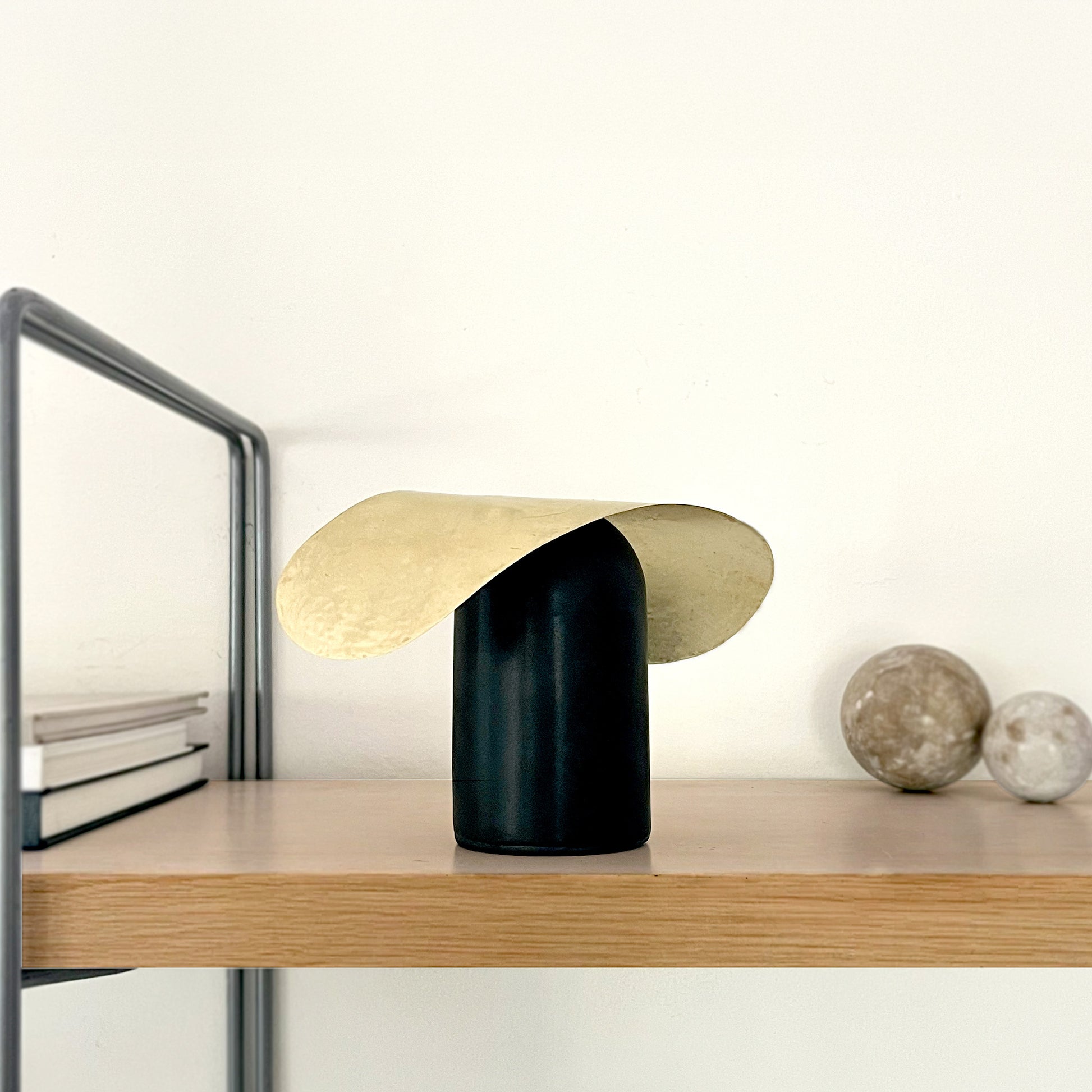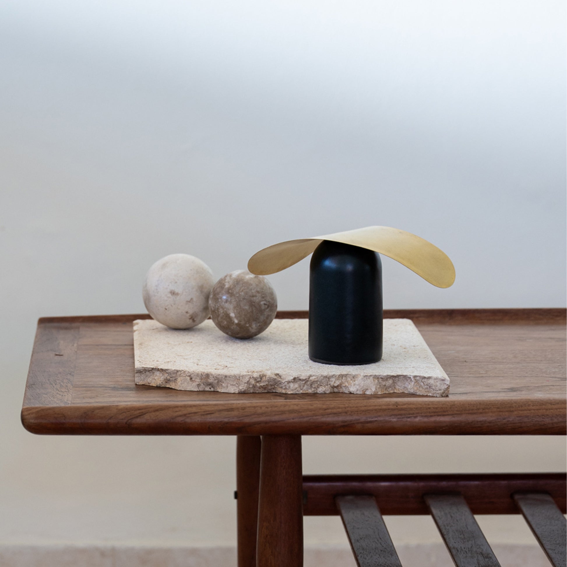 The soft brass form rests lightly on a handmade ceramic base, creating a sense of calm balance and quiet movement.