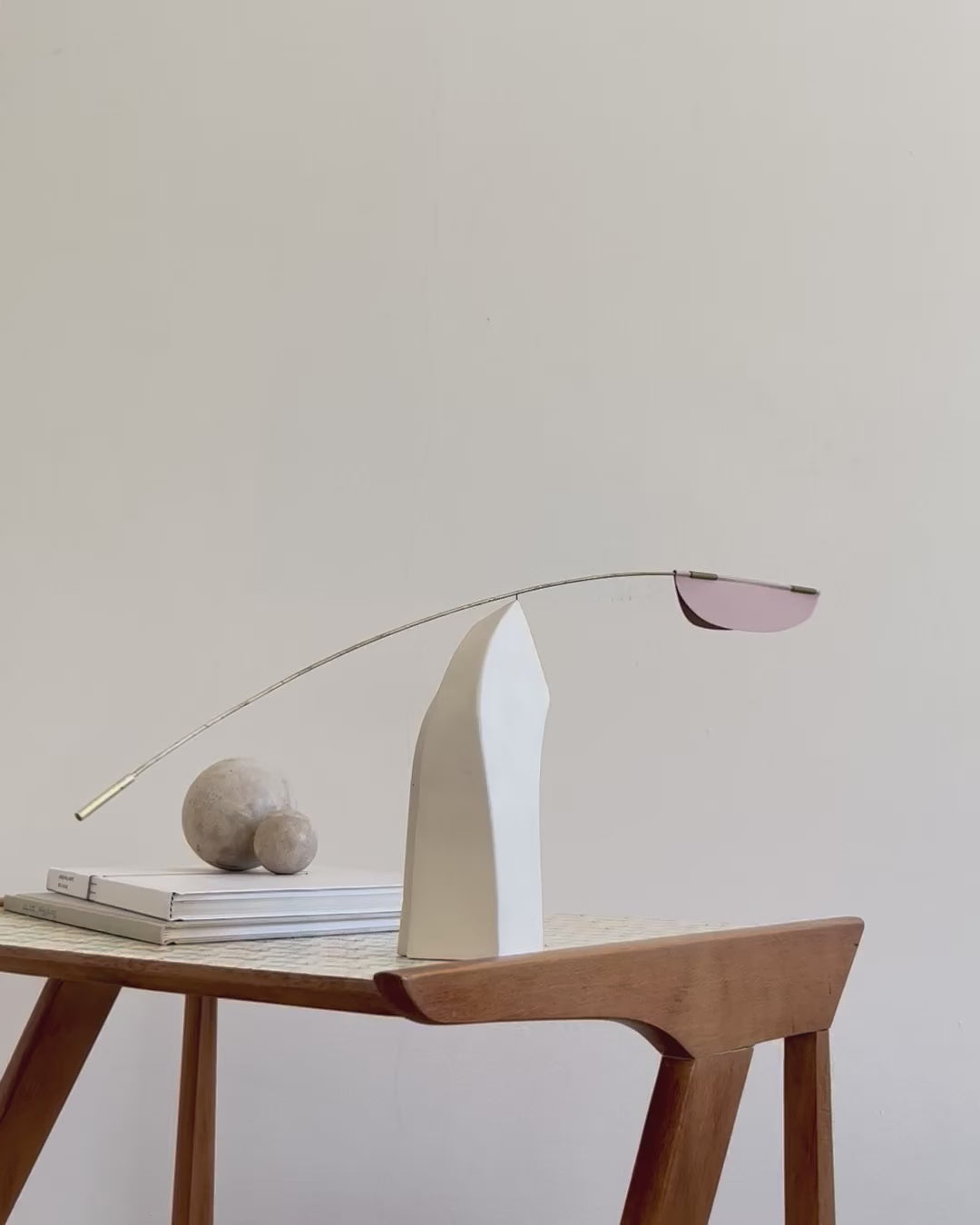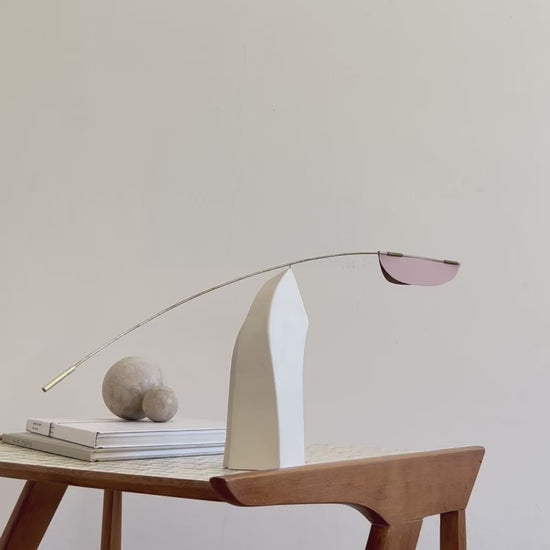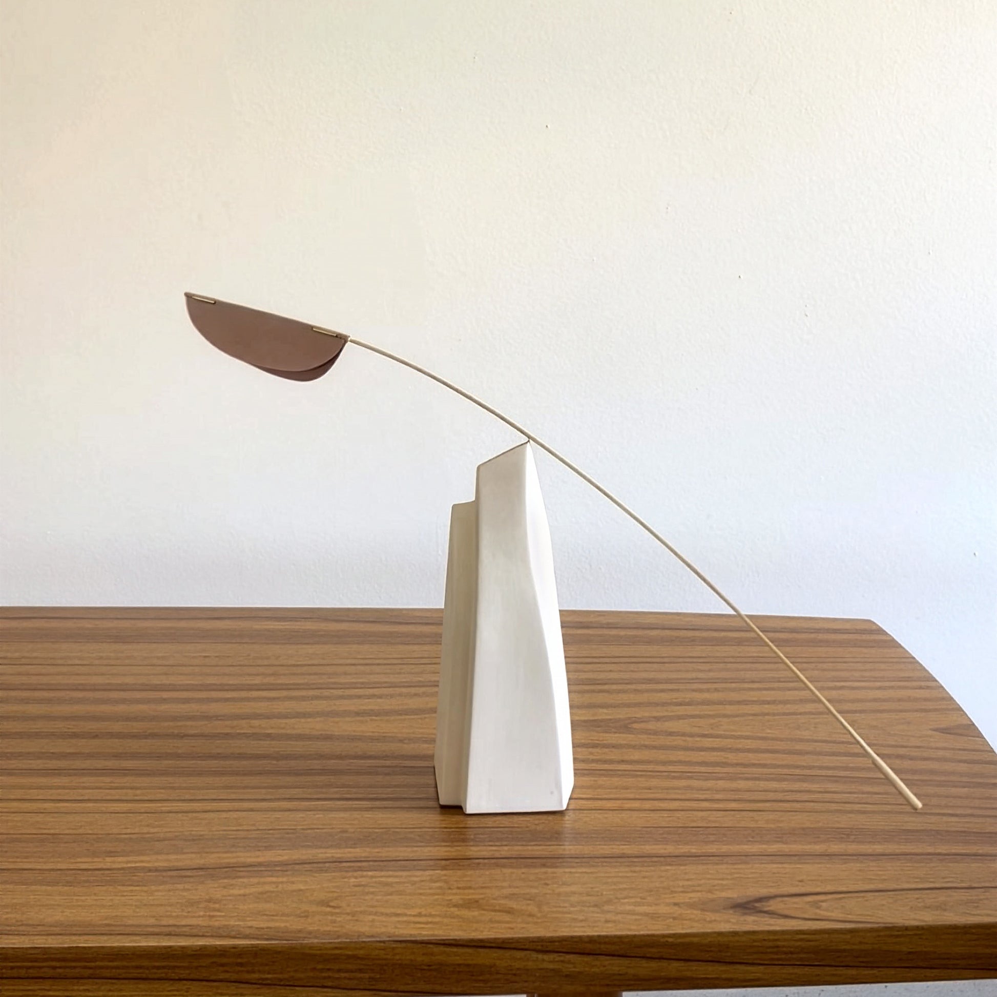 A minimalist tabletop kinetic sculpture handmade from brass, ceramic, and paper. The ceramic base supports a balanced brass arm featuring a paper leaf and a brass weight, which moves gently with the air. A refined piece that adds calm motion and elegance to any interior.