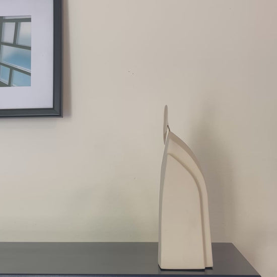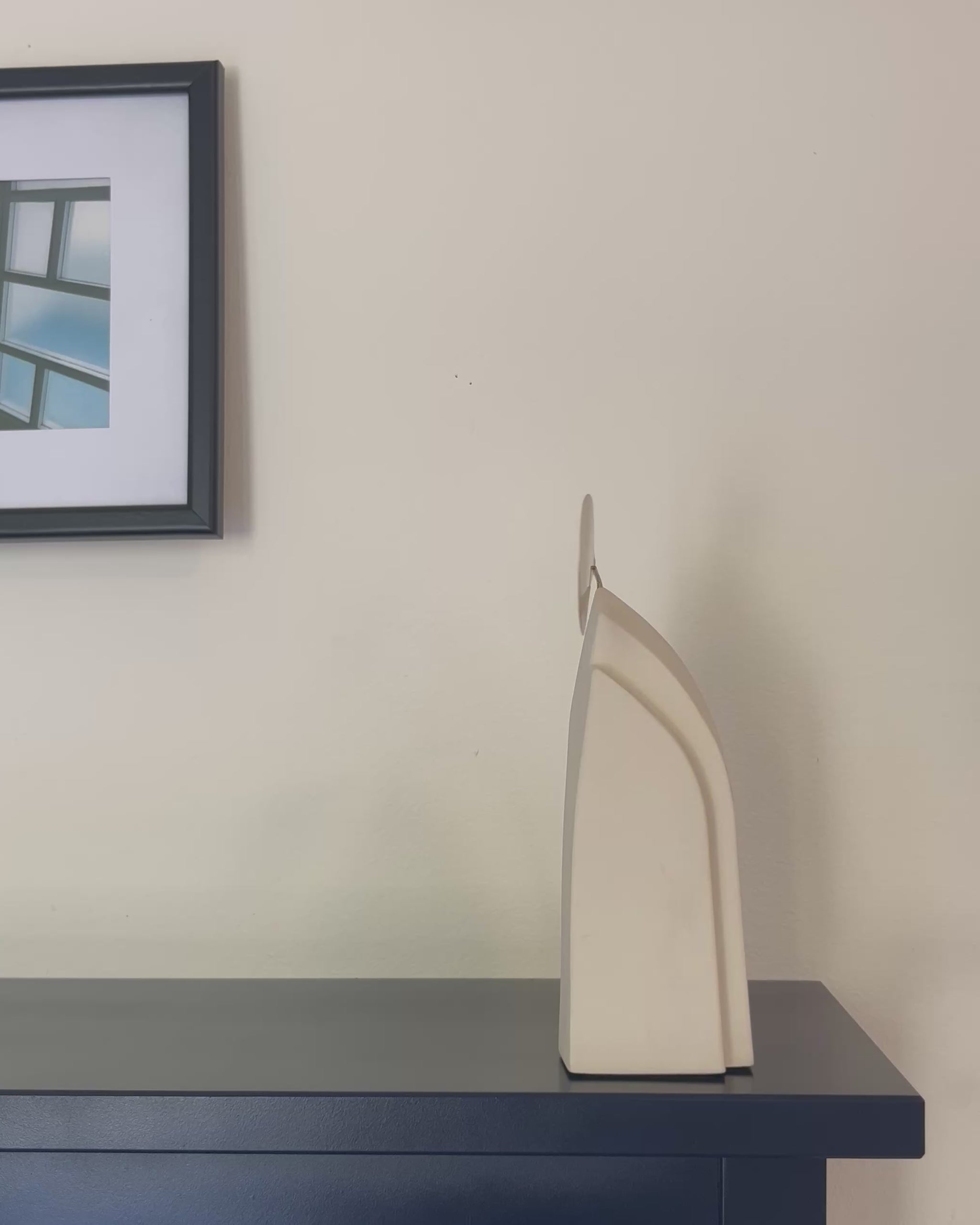 A minimalist freestanding mobile handmade from ceramic and brass. Its geometric base supports a delicate brass arm that moves gently with the air, bringing balance and quiet motion to your space.