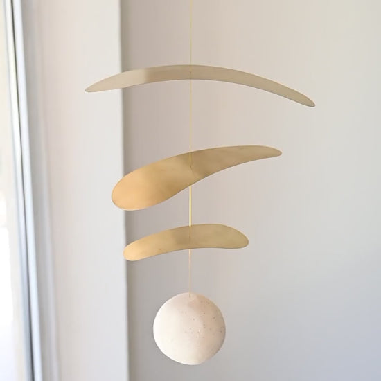 Handmade decorative mobile combining smooth brass shapes and a ceramic sphere.